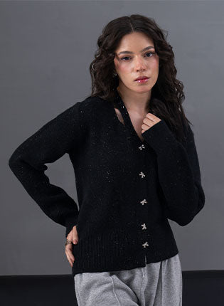 A refined knit cardigan designed to add subtle glamour to cool-weather styling. Crafted in a deep midnight black tone, this piece features an all-over fine sparkle texture that catches the light beautifully without overpowering the look. Designed with a flattering V-neckline and a structured double-button front, it offers a balanced...