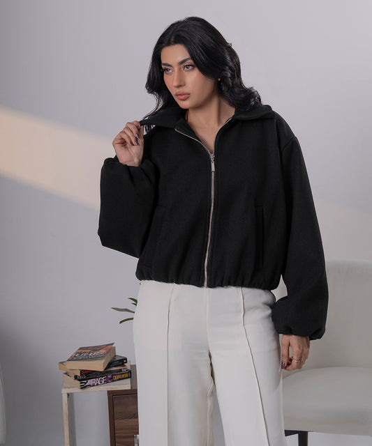 The black jacket your wardrobe has been waiting for. This Sculpted Bomber takes the classic aviator shape and modernizes it with oversized sleeves, a high funnel neck, and a dramatic cropped waist. It’s the ultimate cool-girl staple that adds instant structure to any outfit.