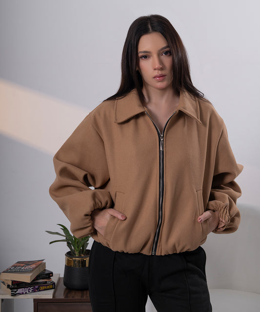 Warm tones for cool days. The Sculpted Bomber in Camel offers a rich, caramel hue in our signature architectural silhouette. With its high collar and voluminous sleeves, this jacket radiates warmth and luxury. It is the perfect companion for blue denim or all-white ensembles.