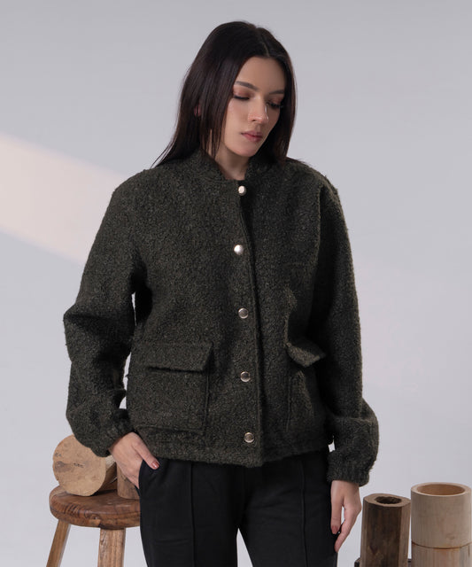 Cozy never looked this cool. This Textured Bouclé Utility Jacket embraces the "Eclectic Grandpa" trend with its rich, nubby texture and earthy olive-grey tone. Featuring a collarless neckline and two large statement patch pockets, it’s the perfect blend of vintage charm and modern utility. Why You'll Love It: Fabric: Rich,...