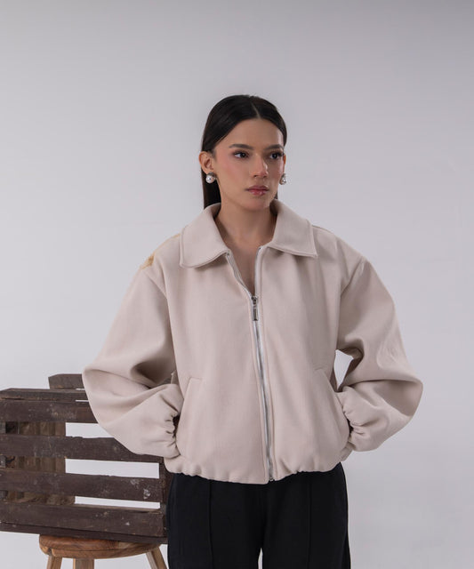 Clean lines and architectural volume. The Sculpted Cloud Bomber features a high-stand collar and a cropped, elasticated waist that creates a flattering, hourglass silhouette. Made from a smooth, premium fabric with a soft-touch finish, this jacket is the definition of "quiet luxury." It’s effortless enough for leggings but chic enough...