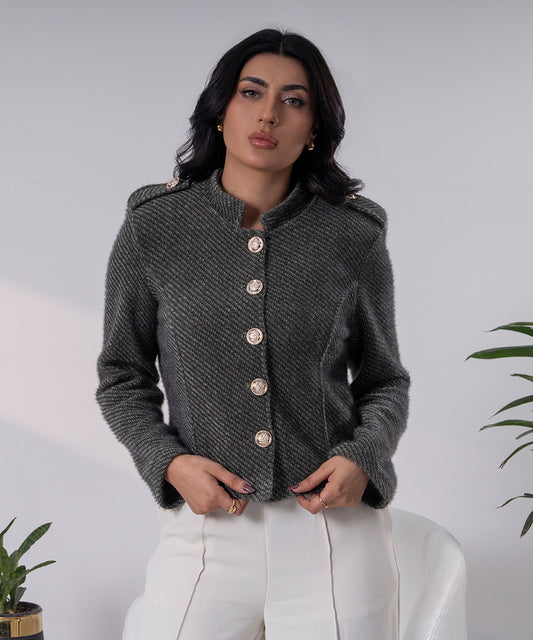 A timeless statement piece designed to blend structure with everyday comfort. This knit jacket features a refined, tailored silhouette crafted from a textured ribbed fabric that feels substantial yet wearable. The high stand collar adds a polished touch, while the decorative metallic button-front closure brings a subtle military-inspired elegance. Defined...