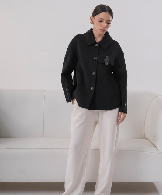 Structure meets street style. The Noir Industrial Clasp Shacket is the ultimate transition piece for your capsule wardrobe. Crafted from a heavy-weight, premium felt that holds its boxy shape, this piece redefines the utility trend. The focal point is the silver-tone industrial lobster clasp on the chest pocket—a striking hardware...