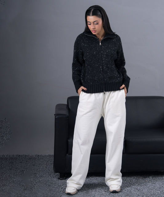 A refined winter essential with a subtle touch of sparkle. This cardigan is crafted in a soft, textured knit with delicate shimmer woven throughout, adding understated elegance while remaining easy to wear. Designed with a cozy high neckline and a smooth front zip closure, it offers both warmth and versatility....