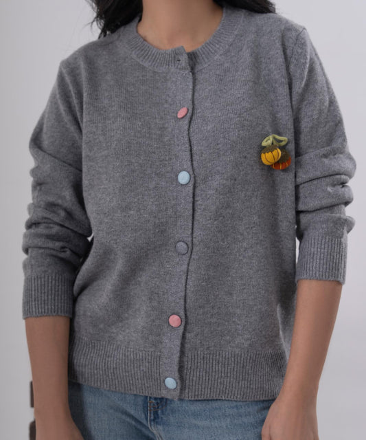A timeless knit essential elevated with playful detailing. This soft grey cardigan features a structured high neckline and a full front button closure accented with multicolour buttons that add a subtle pop of character while keeping the overall look refined. Designed with a comfortable fit and ribbed cuffs and hem,...