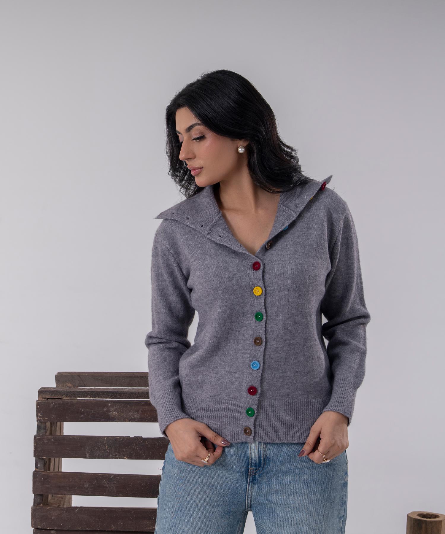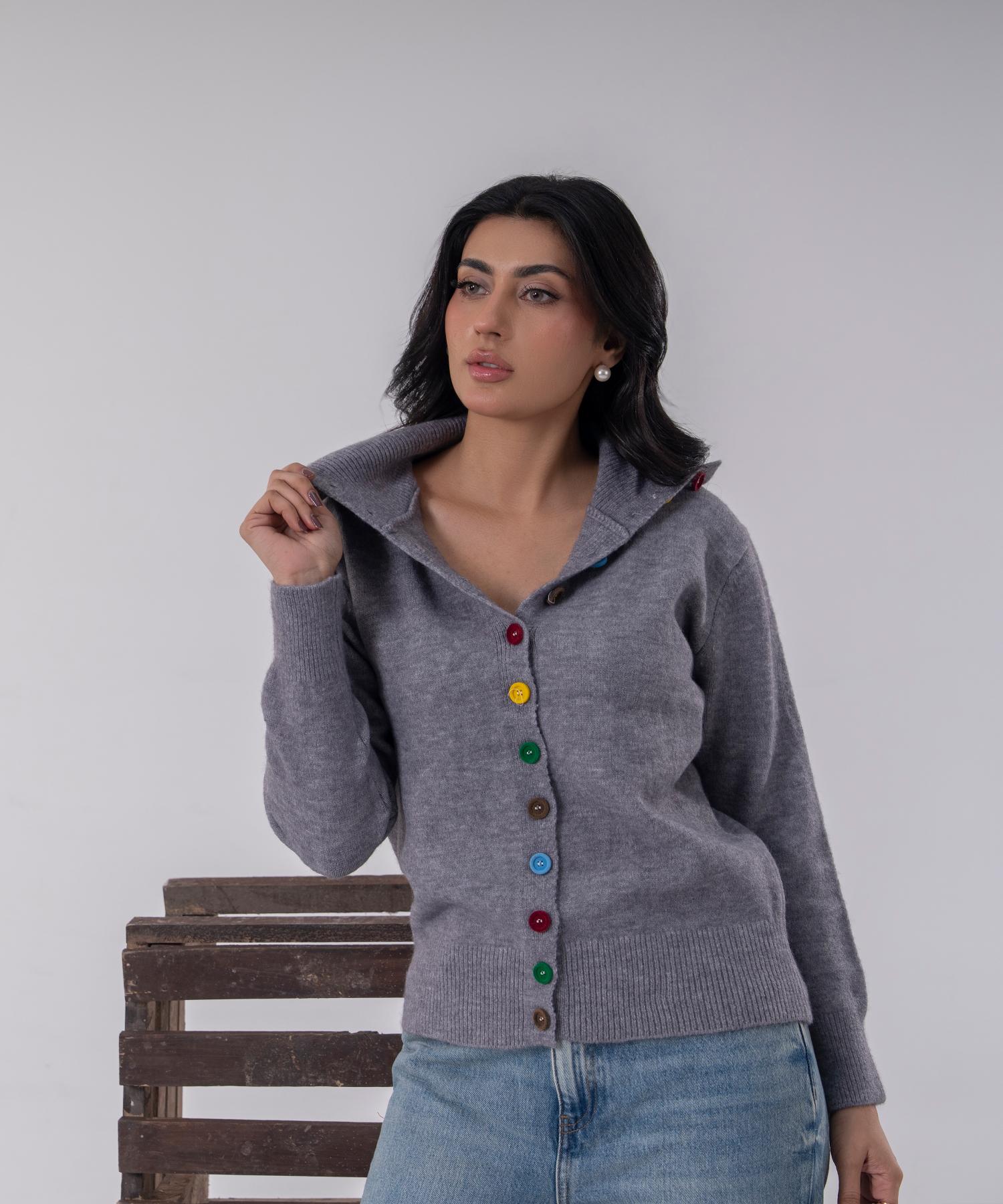 The rounded neckline and tonal button closure create a clean, balanced finish, making it perfect for layering over dresses, shirts, or simple tees. Subtle ribbed cuffs and hem ensure a comfortable fit while maintaining a polished appearance.