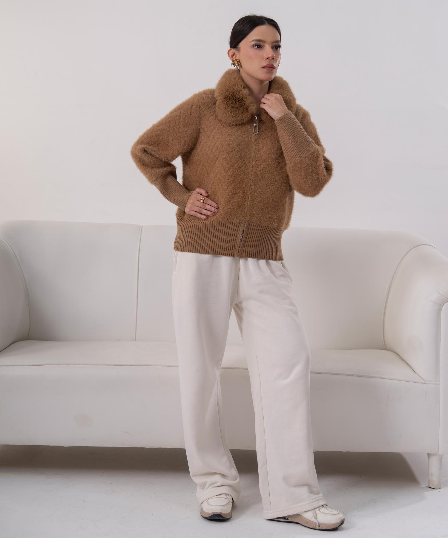 A statement winter essential designed to combine warmth with refined elegance. This ivory knit jacket features a soft, plush-textured body that offers a cozy feel, elevated by a luxurious faux fur collar for added sophistication. The clean front zip closure creates a streamlined silhouette, while ribbed cuffs and hem provide structure and comfort.