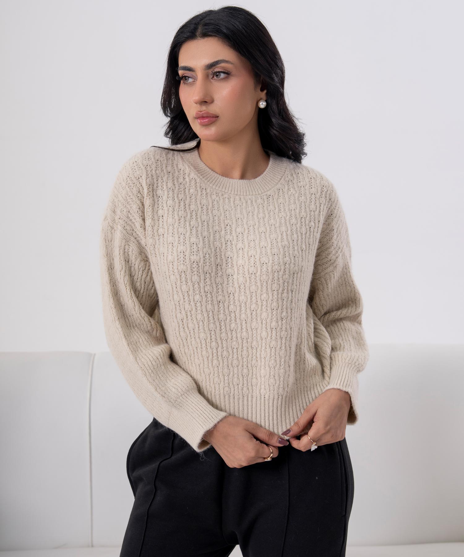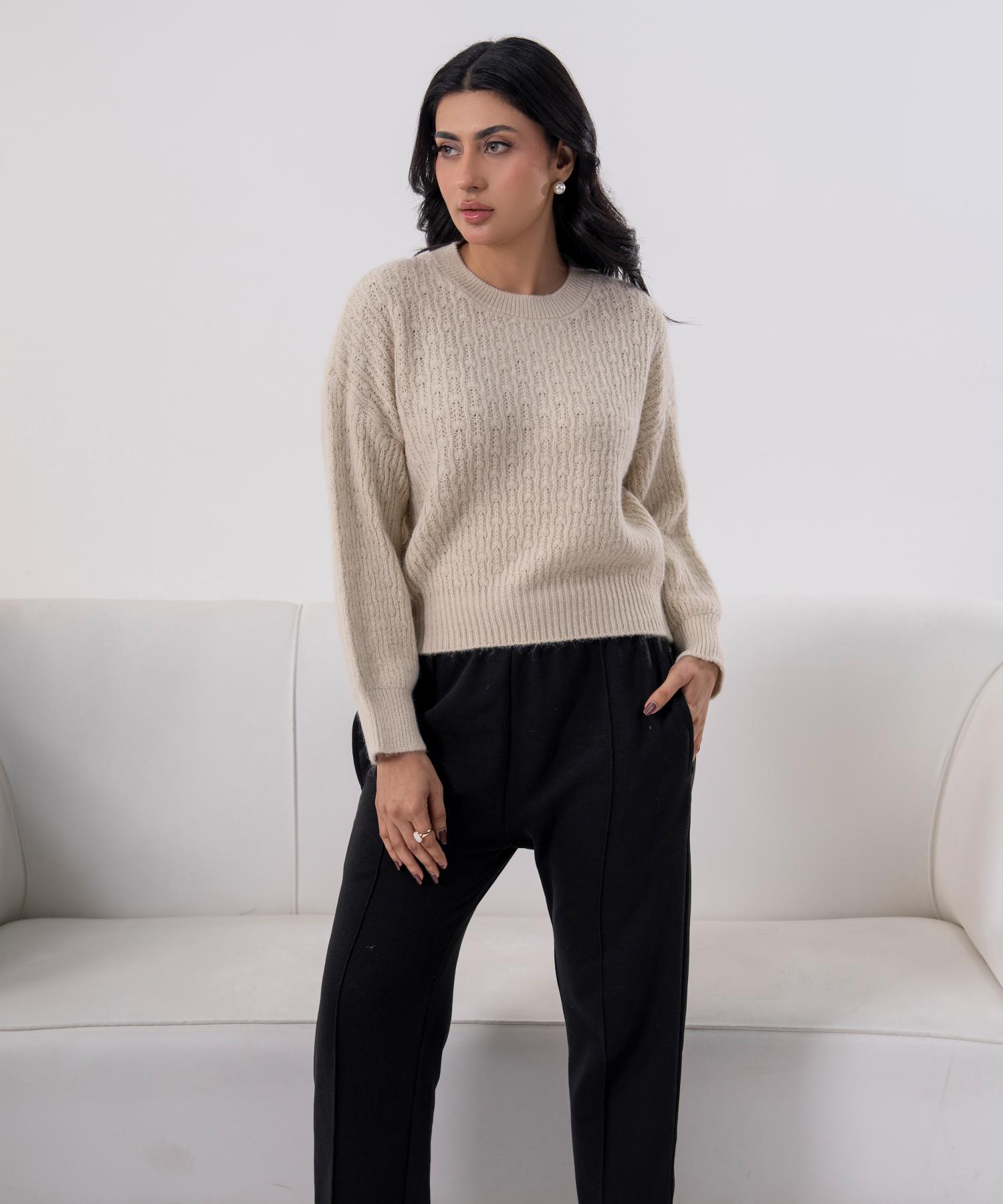 Designed with a classic round neckline, ribbed cuffs, and hem, it offers a comfortable fit while maintaining a polished silhouette. The smooth knit texture and soft color palette make it easy to pair with denim, trousers, or skirts for an effortlessly cute winter look.
