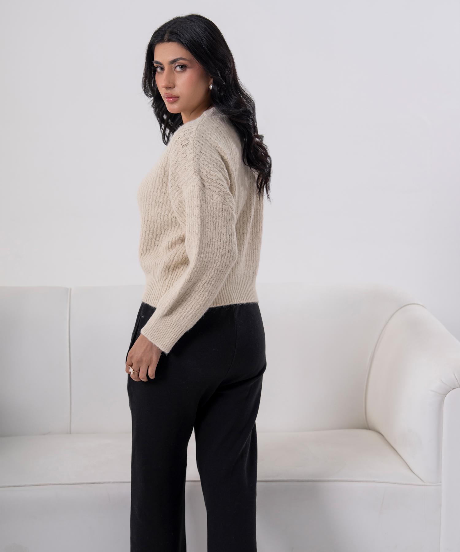 A cozy statement piece designed to bring warmth and charm to everyday winter styling. Crafted in a soft ivory knit, this sweater features a hand-finished bunny character motif at the front, adding a playful yet tasteful touch.