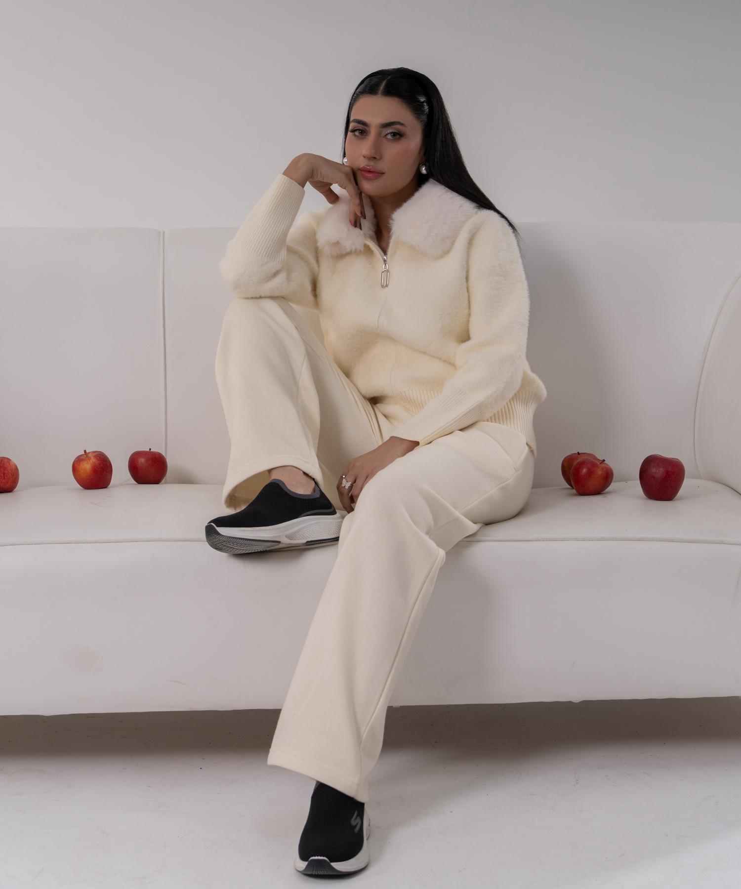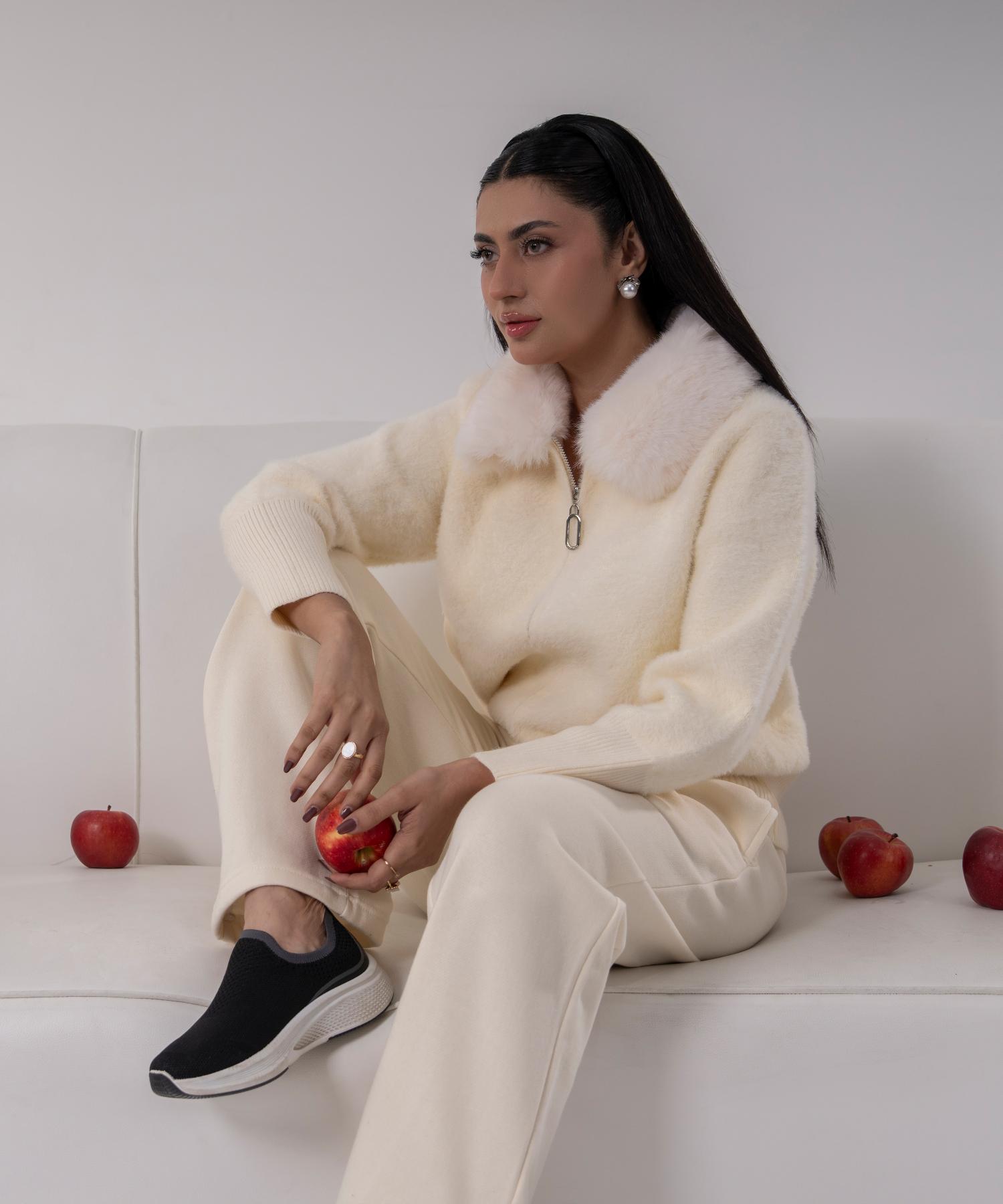 Ivory Plush Knit Jacket with Faux Fur Collar