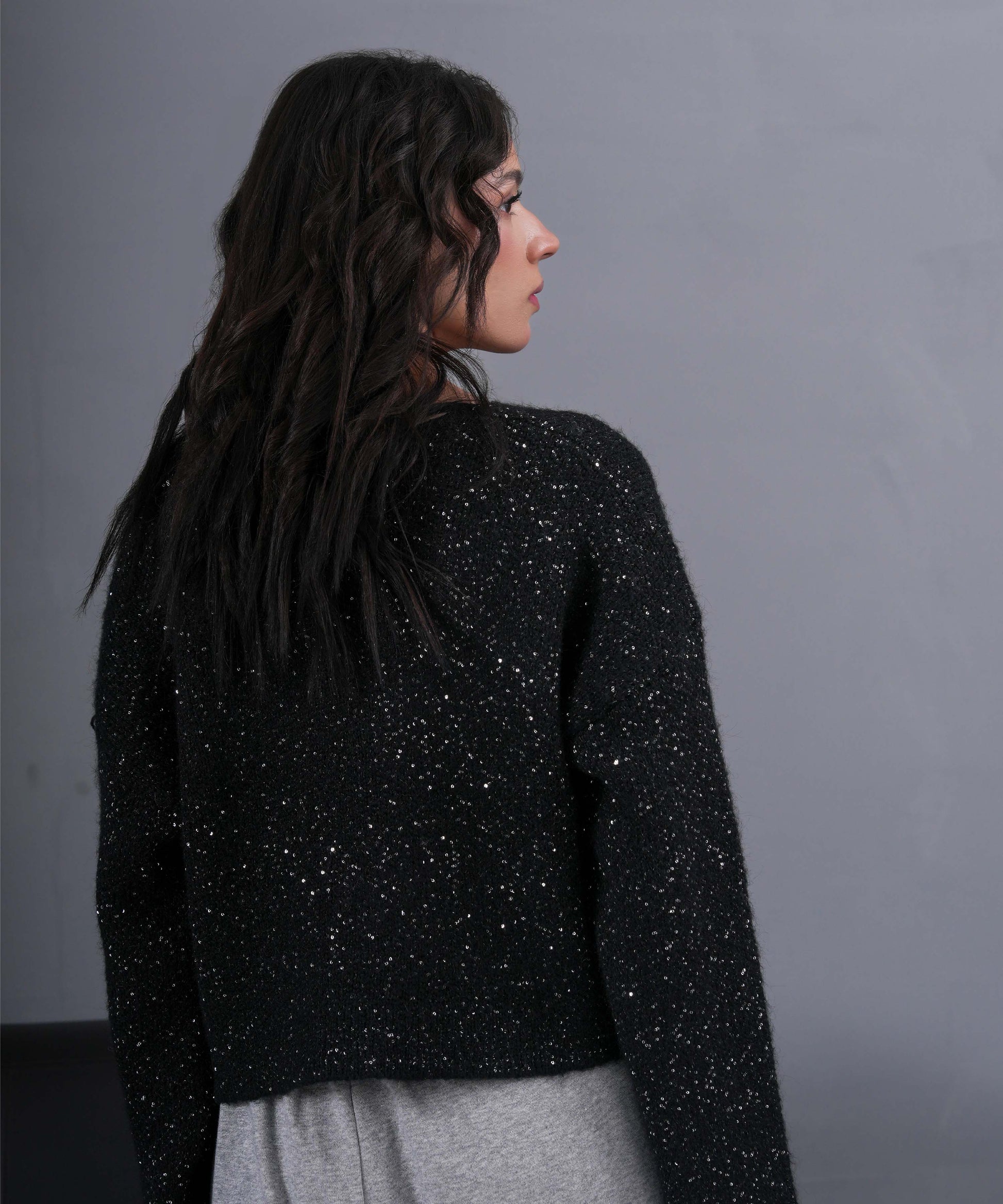 A refined knit cardigan designed to add subtle glamour to cool-weather styling. Crafted in a deep midnight black tone, this piece features an all-over fine sparkle texture that catches the light beautifully without overpowering the look.