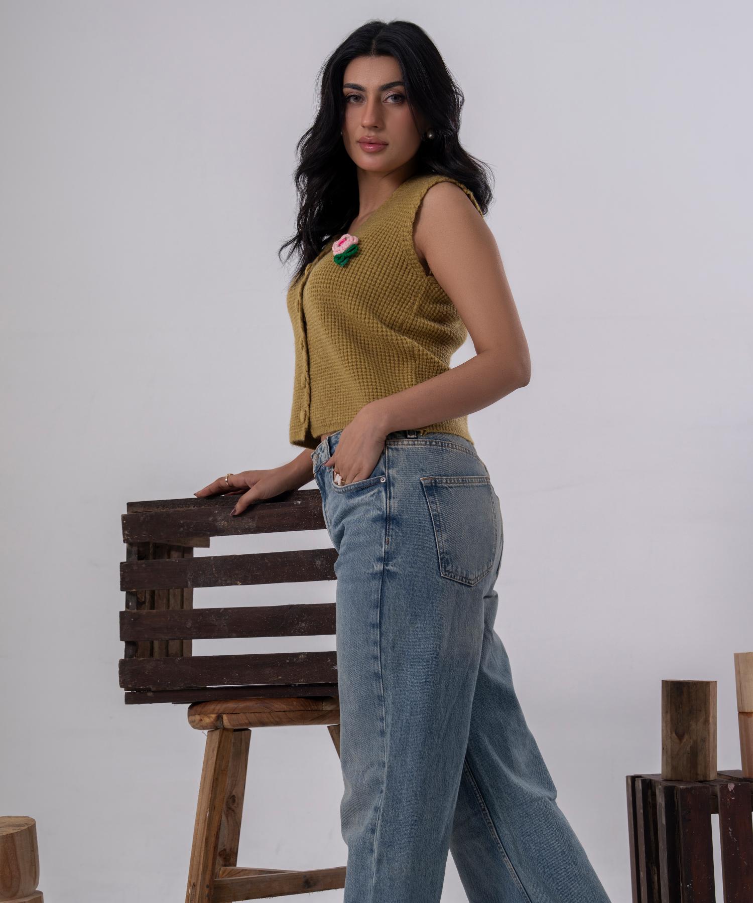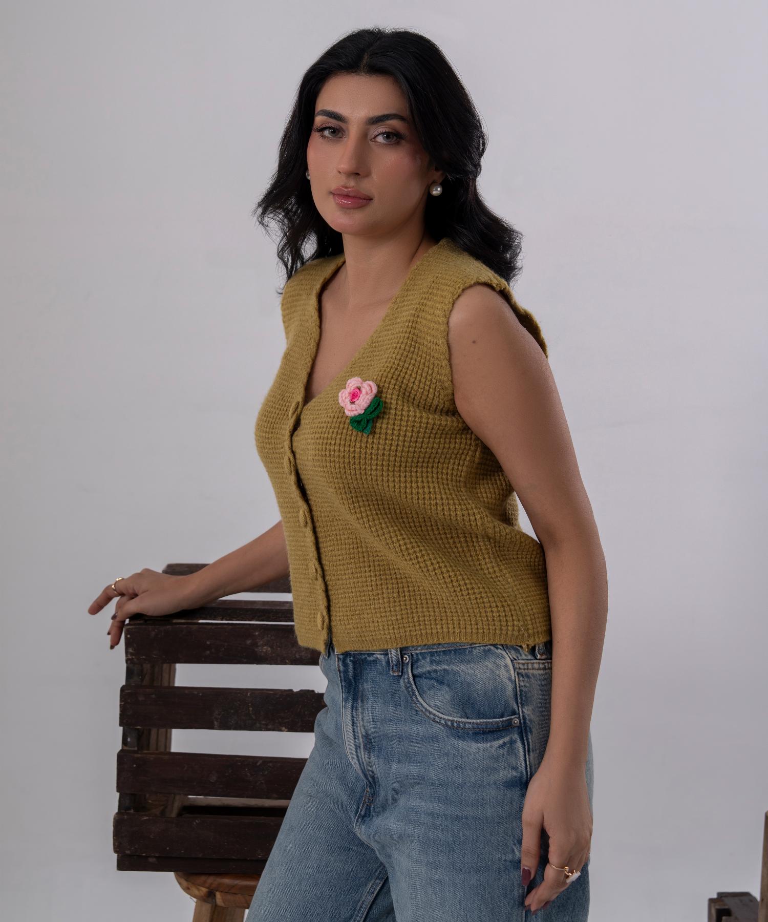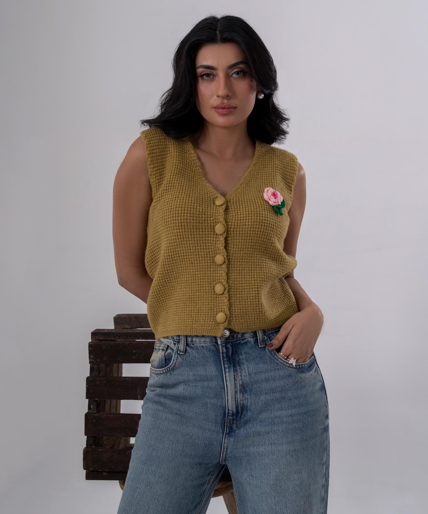 Olive Bloom Buttoned Knit Vest