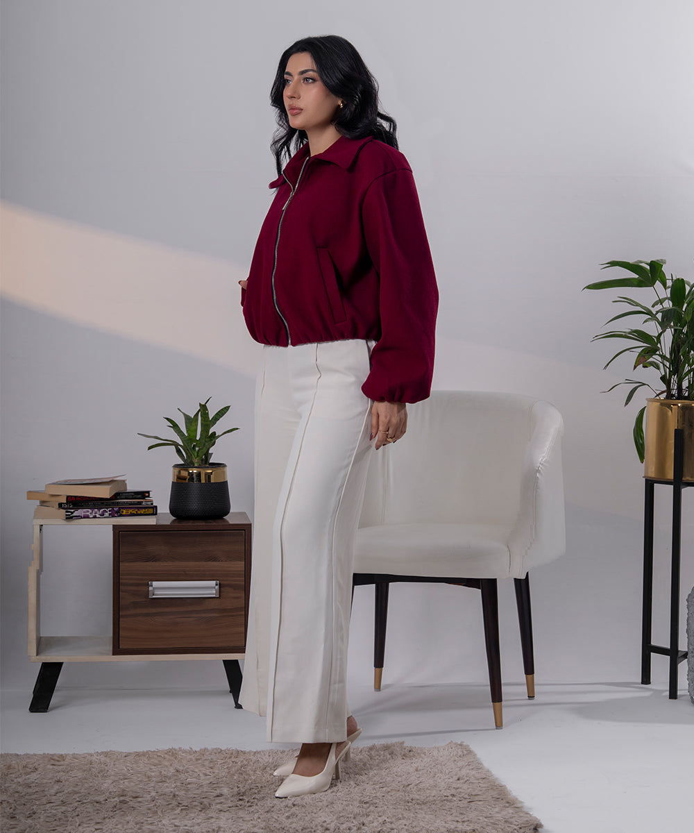 The structured front zip ensures ease and comfort, while the ribbed hem and cuffs provide a flattering, secure fit. Finished with functional side pockets and a cozy inner feel, this jacket is ideal for chilly days when style matters as much as warmth.